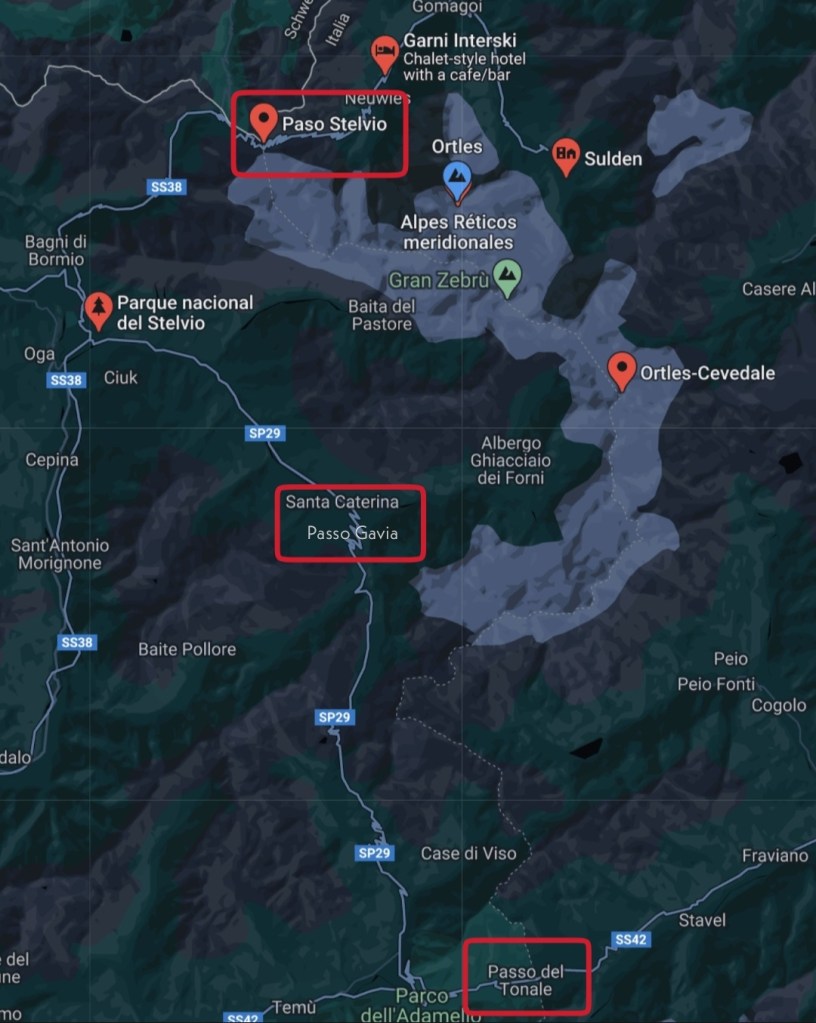 Entramos por el Sur, Passo Tonale => seguimos por el Oeste, Passo Gavia => y cruzamos al Este por el Passo Stelvio.