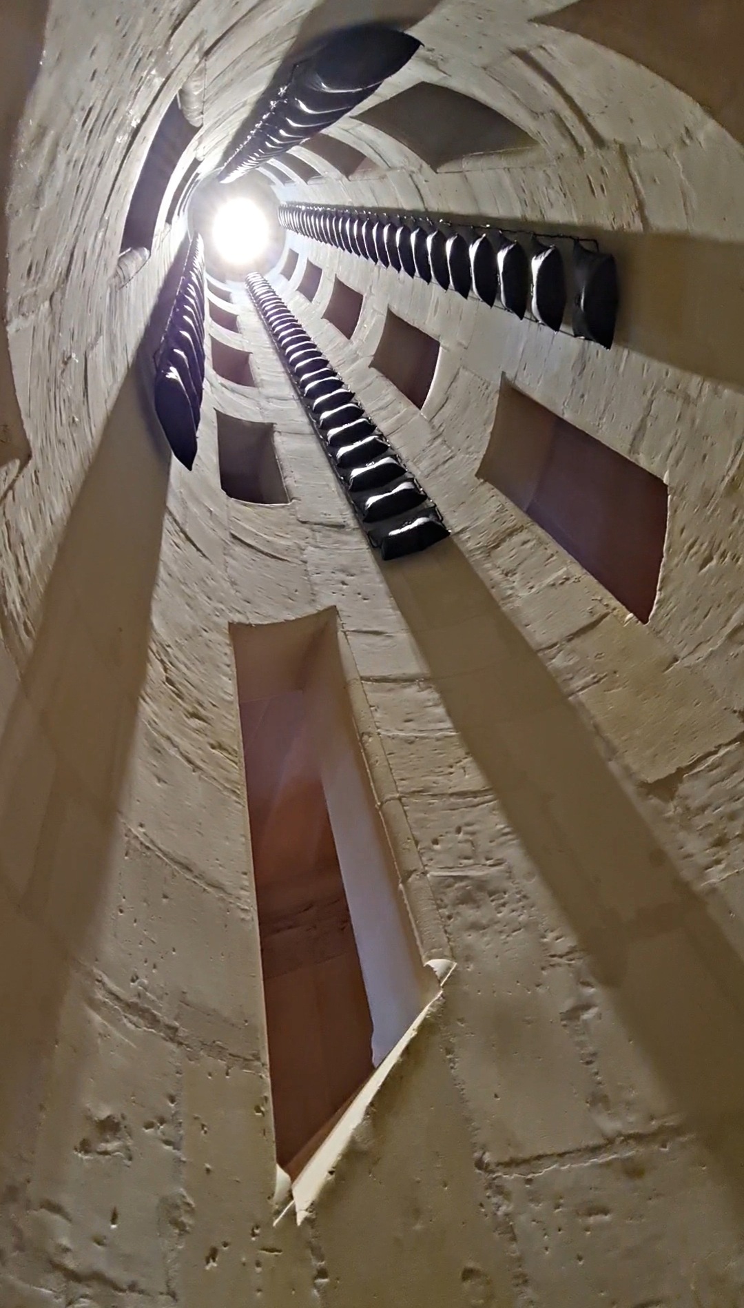 Se eleva desde la planta baja hasta las terrazas intermedias, pero lo que la hace especial es su peculiaridad: una persona puede subir mientras otra baja sin cruzarse en el camino. Esta ilusión se debe a que la estructura de la escalera consta de dos tramos que se entrelazan como hebras de una hélice.
