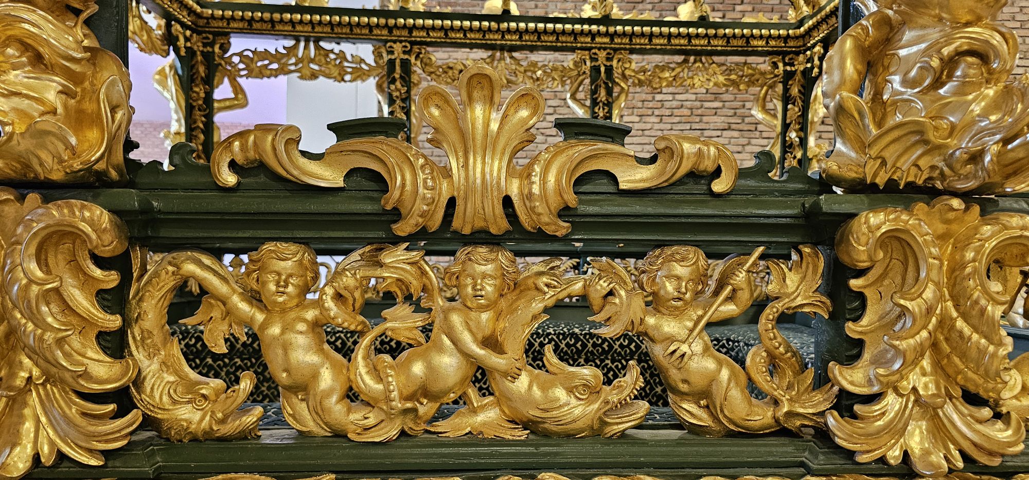 La proa muestra una sirena con el escudo real y en la popa hay un león alado con un cetro. El pabellón, sostenido por tritones y nereidas, tiene su techo calado rematado con la Fama y las armas reales de Carlos II. El friso entre la borda y la línea de flotación está adornado con figuras de nereidas, tritones, delfines y monstruos marinos, así como talla de follaje y flores.