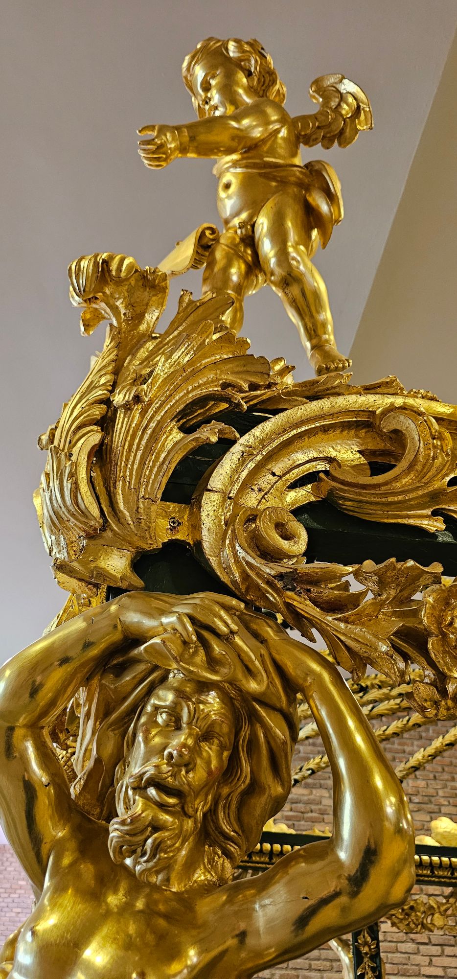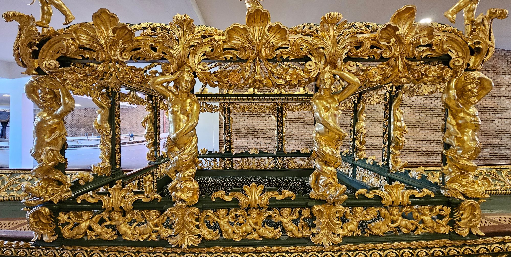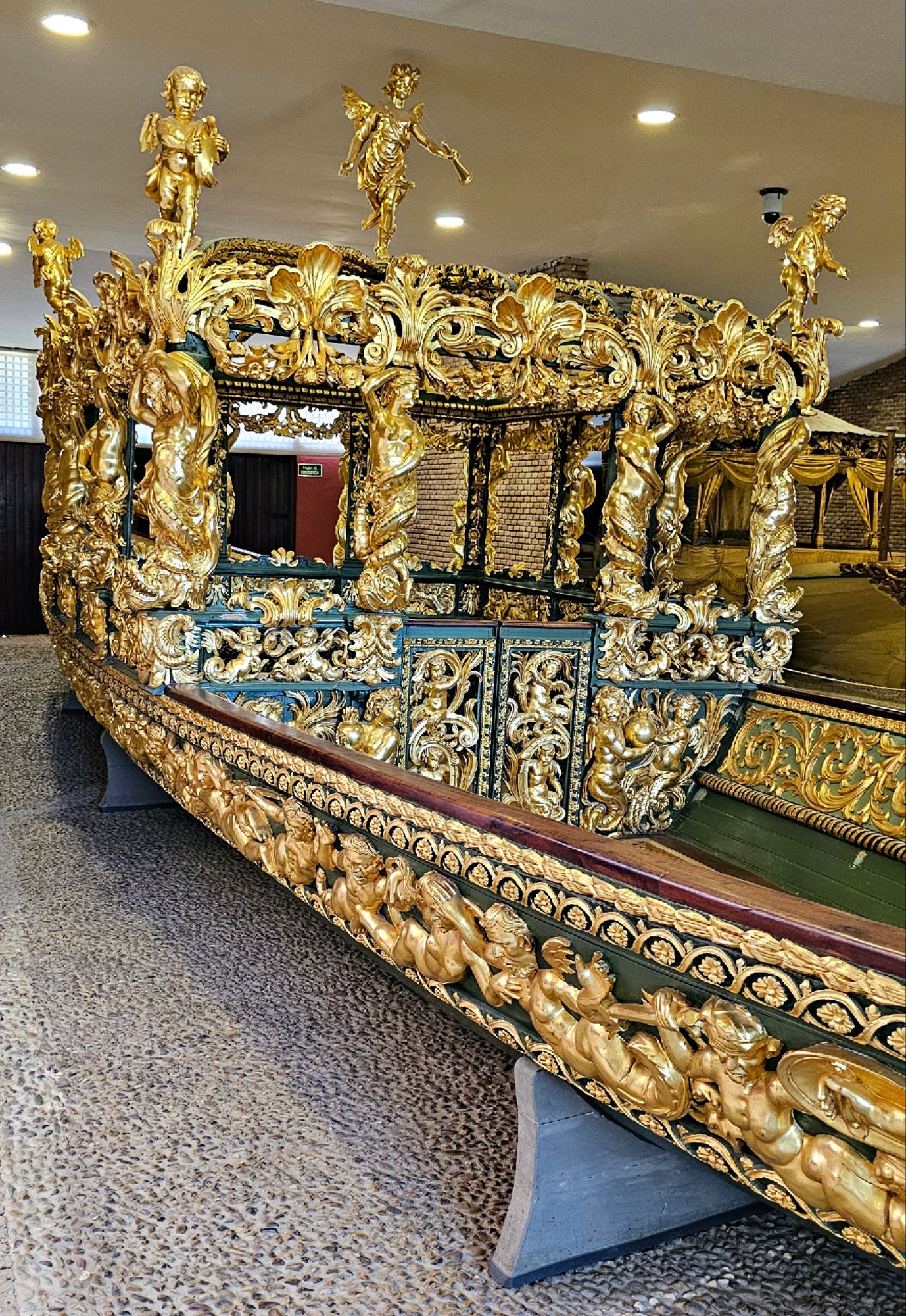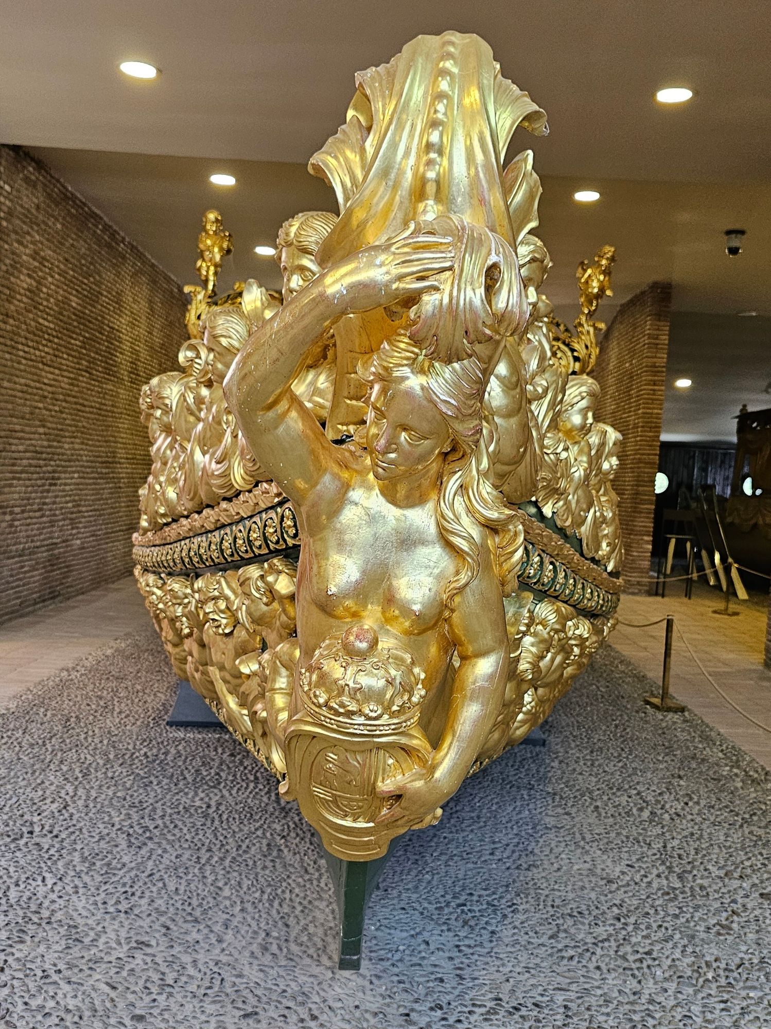 La escultura tallada y dorada se distribuye en la proa, los ángulos del pabellón y la popa. Destacan figuras como la de un amorcillo sosteniendo una alabarda en la proa y la cabeza de Medusa en la popa, junto al escudo de armas policromado. Otras tallas decorativas, como puntas de flecha y veneras, se encuentran dispersas por el casco.