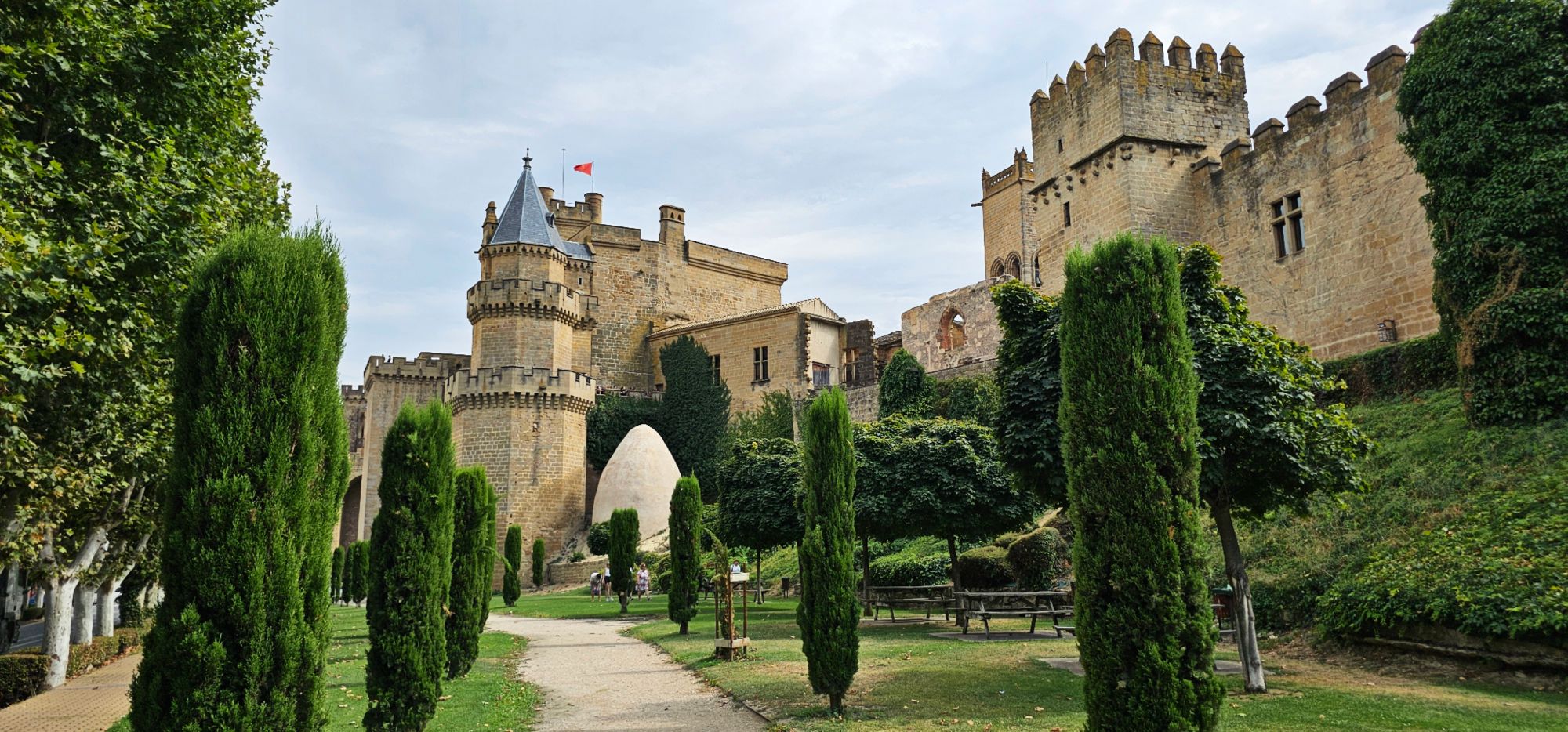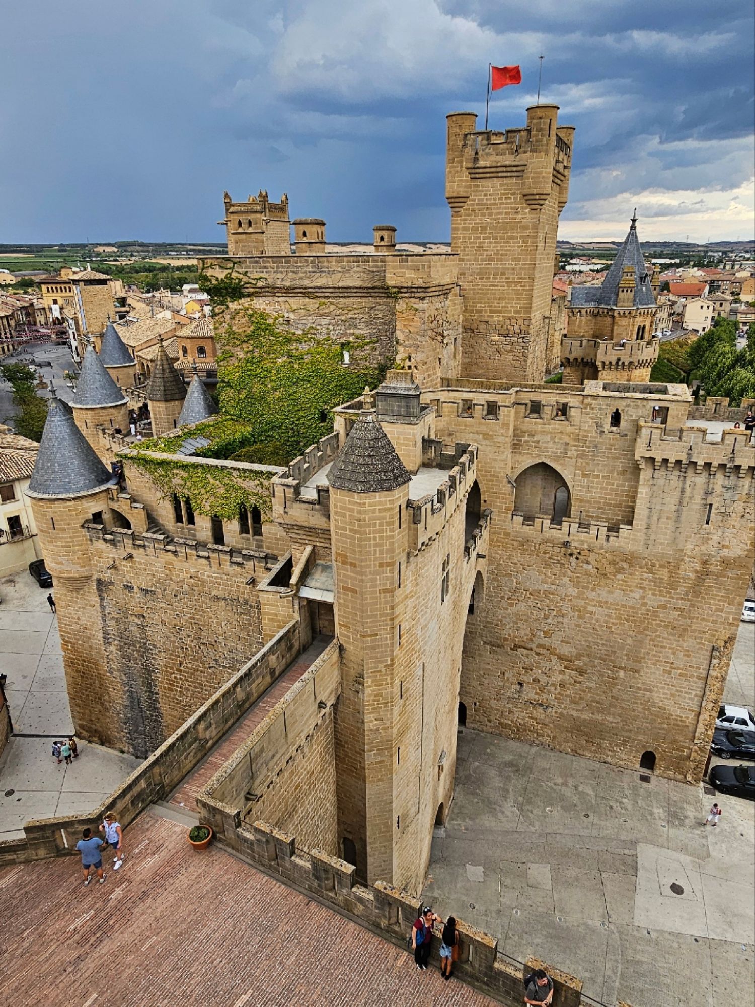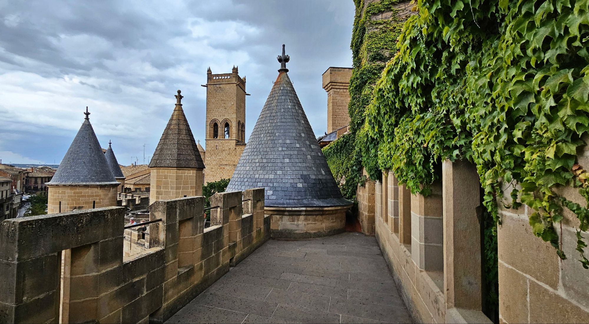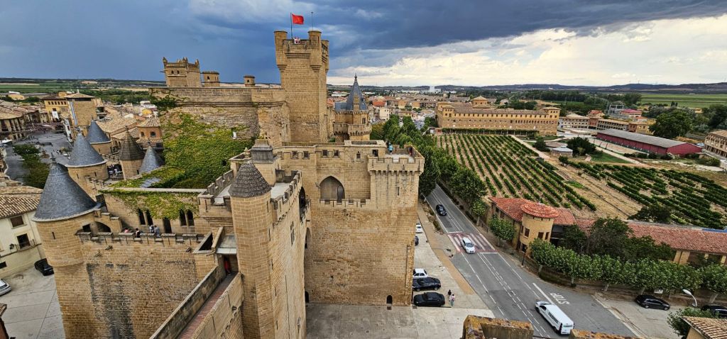 El Castillo de Olite fue la residencia de los reyes navarros, especialmente durante el reinado de Carlos III «El Noble». Se construyó en los siglos XIII y XIV, y lo que lo hace especial no es solo su historia, sino la sensación de estar en un verdadero laberinto medieval. Cuenta con torres puntiagudas, patios rodeados de jardines y terrazas con vistas espectaculares a los campos de viñedos que se extienden hasta el horizonte.