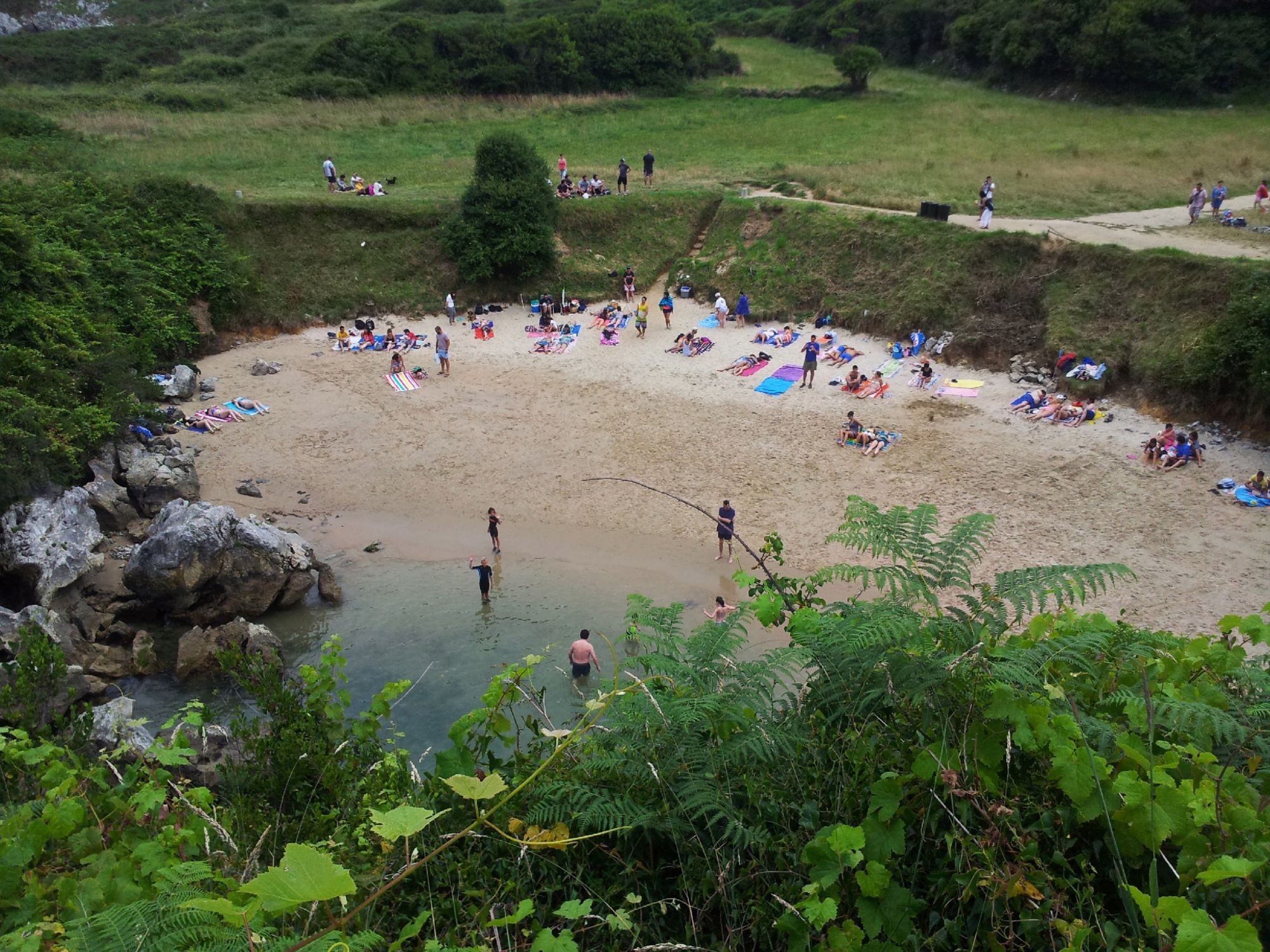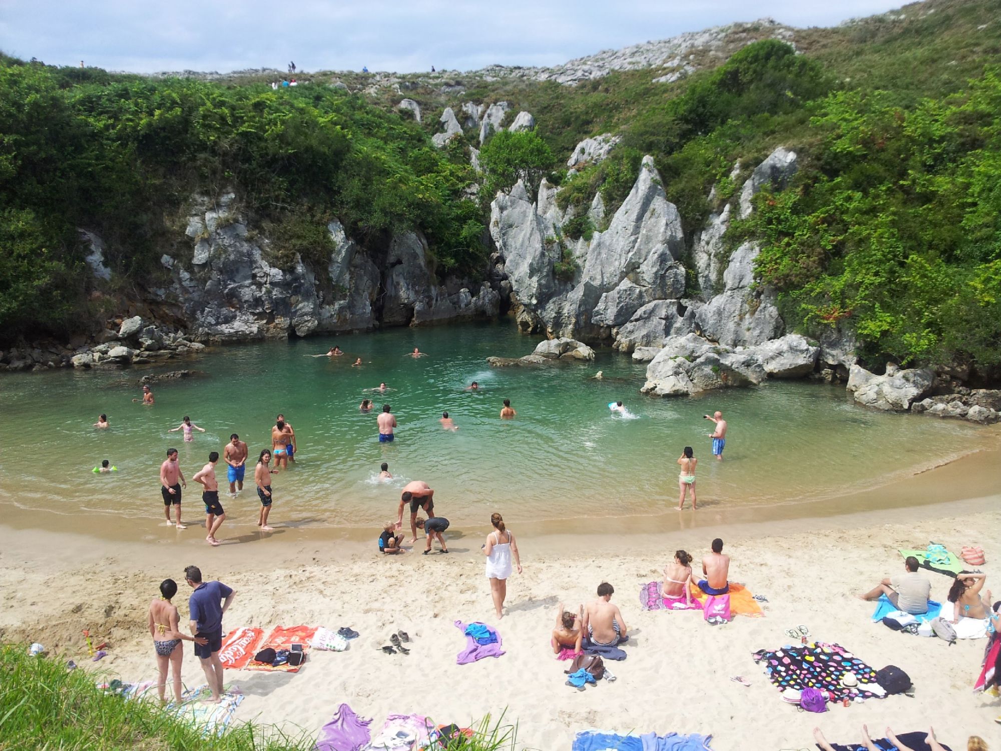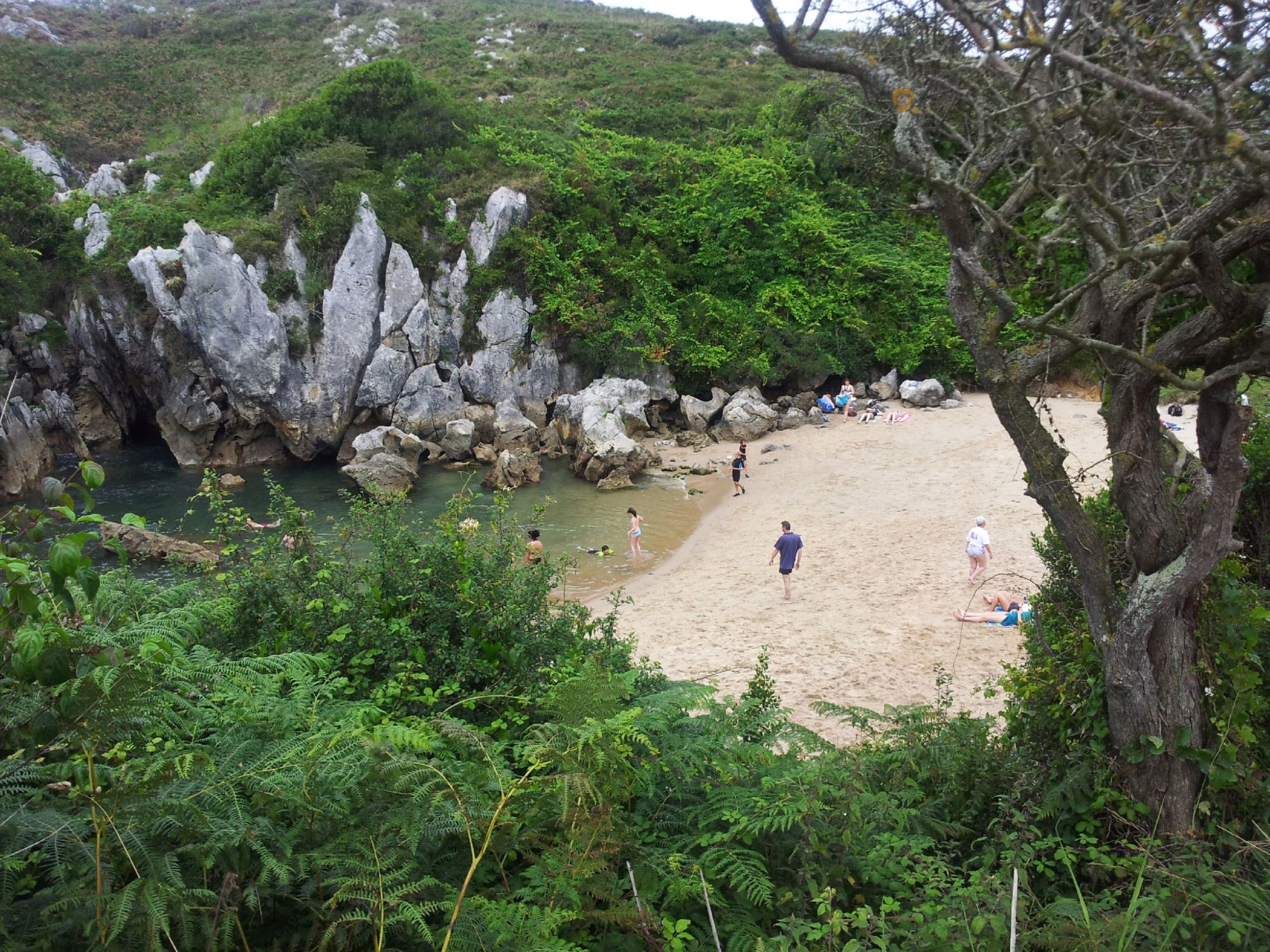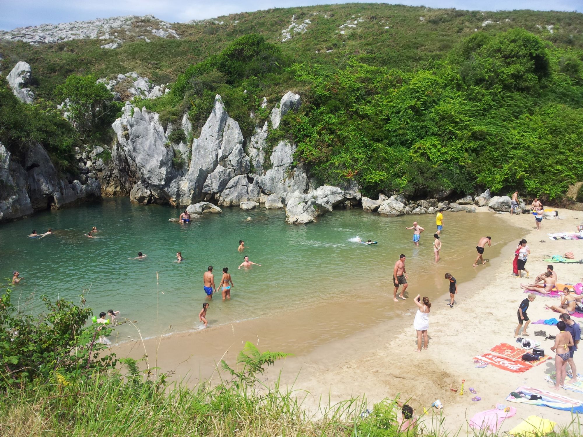 La magia está en la cueva kárstica subterránea que conecta con el mar Cantábrico. Cuando la marea sube, el agua fluye por esta cueva y la playa se llena, permitiéndote bañarte en sus aguas saladas en medio del campo. En marea baja, el agua apenas cubre la arena, y la playa se transforma en una especie de piscina natural.