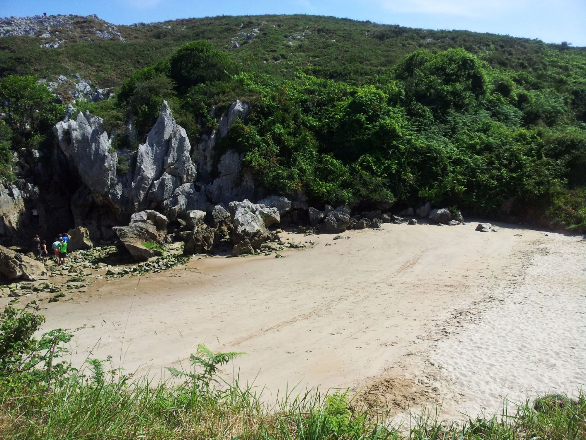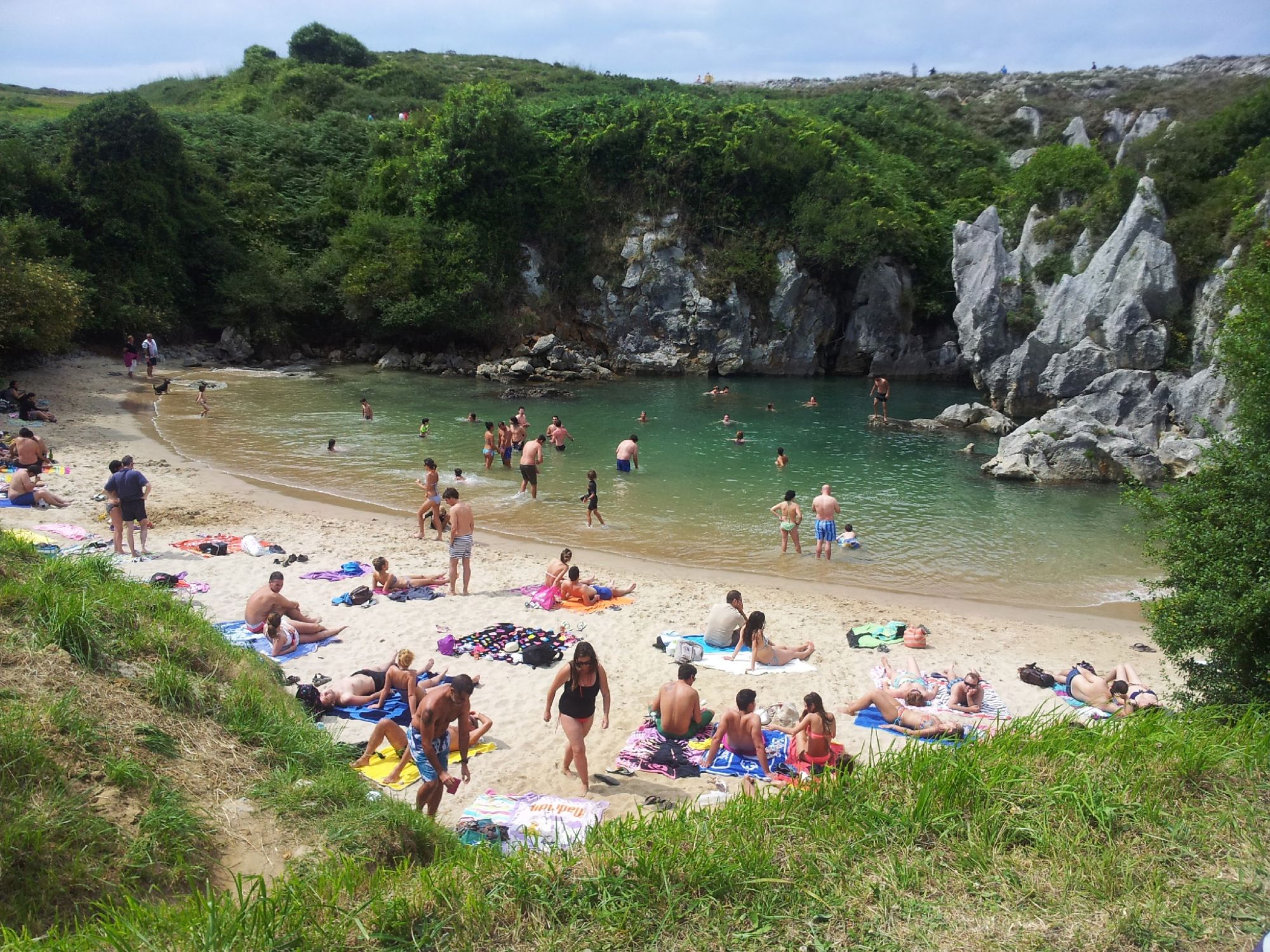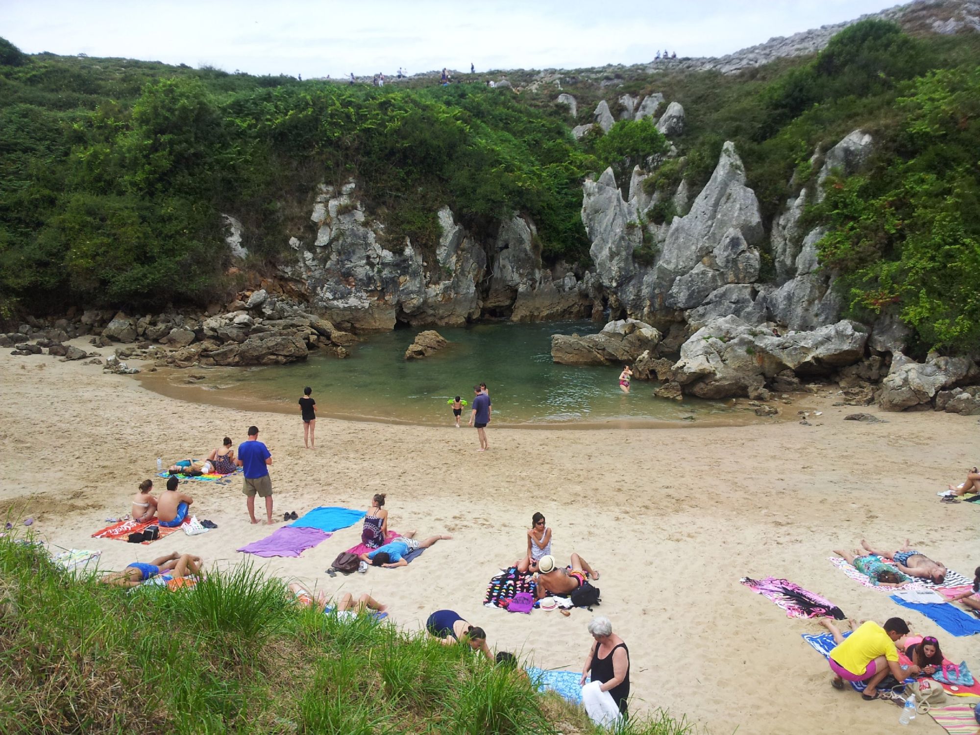 La primera vez que visité Gulpiyuri no sabía bien qué esperar. Había oído hablar de esta pequeña playa escondida tierra adentro, pero lo que encontré superó cualquier descripción. Llegamos tras una caminata corta por un sendero de hierba desde el aparcamiento cercano. De pronto, entre el paisaje rural, una media luna de arena fina y dorada, abrazada por paredes de roca y vegetación. El sonido del oleaje llegaba misteriosamente… sin ver el mar.