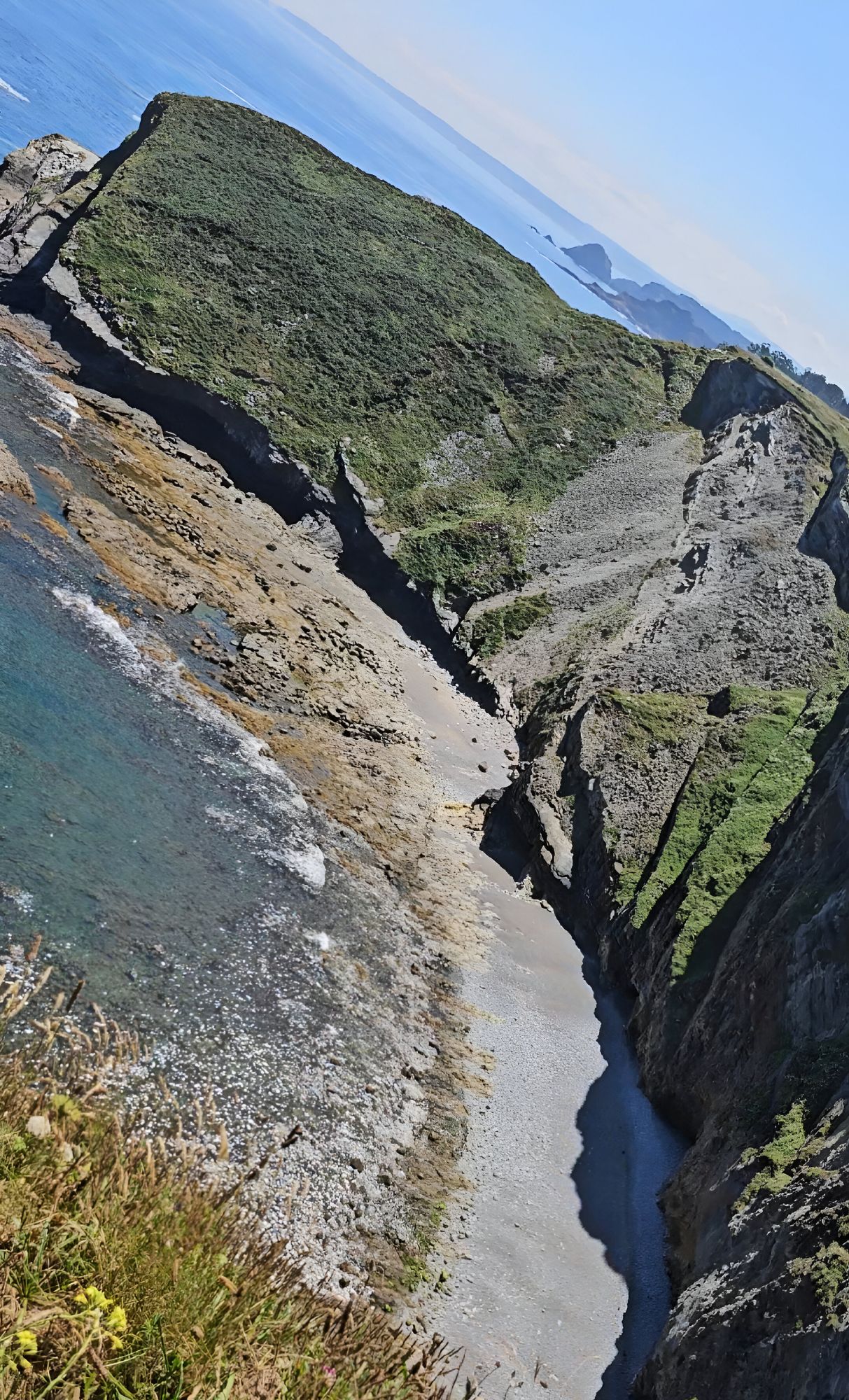 Una playa sin mar a la vista. Es una cala secreta, formada por un túnel natural que conecta el Cantábrico con un claro de arena escondido entre prados. Solo se llega a pie. Es pequeña, sí, pero en ella caben siglos de geología, poesía y asombro.