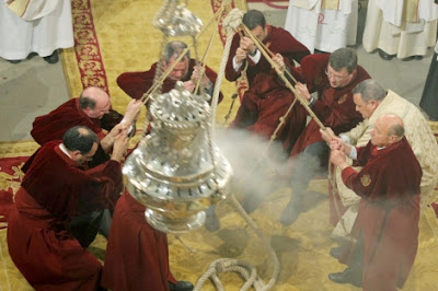 Presenciarlo es un momento difícil de describir. Primero, el silencio. Después, el olor del incienso que empieza a llenar la nave. Y entonces, el movimiento. Lento al principio, pero creciendo con cada tirón, hasta convertirse en un péndulo que parece tocar el cielo del crucero. El sonido de las poleas, el murmullo de los presentes y la nube de incienso se funden en una coreografía que une pasado y presente, tradición y asombro.