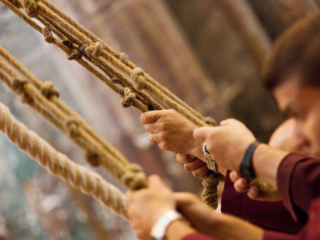 Con un ritmo ensayado durante siglos, tiran de las cuerdas con fuerza y coordinación milimétrica, hasta que el incensario toma vida, se convierte en péndulo, y en pocos segundos surca el aire con una elegancia hipnótica.