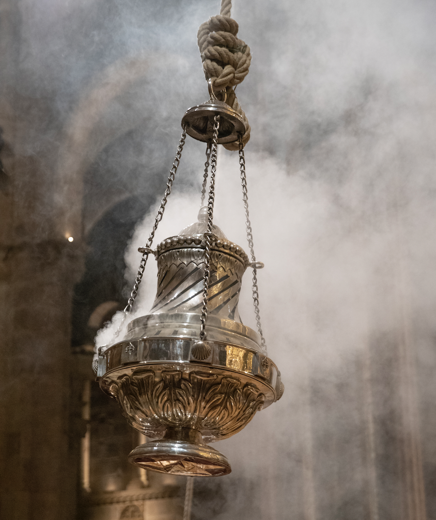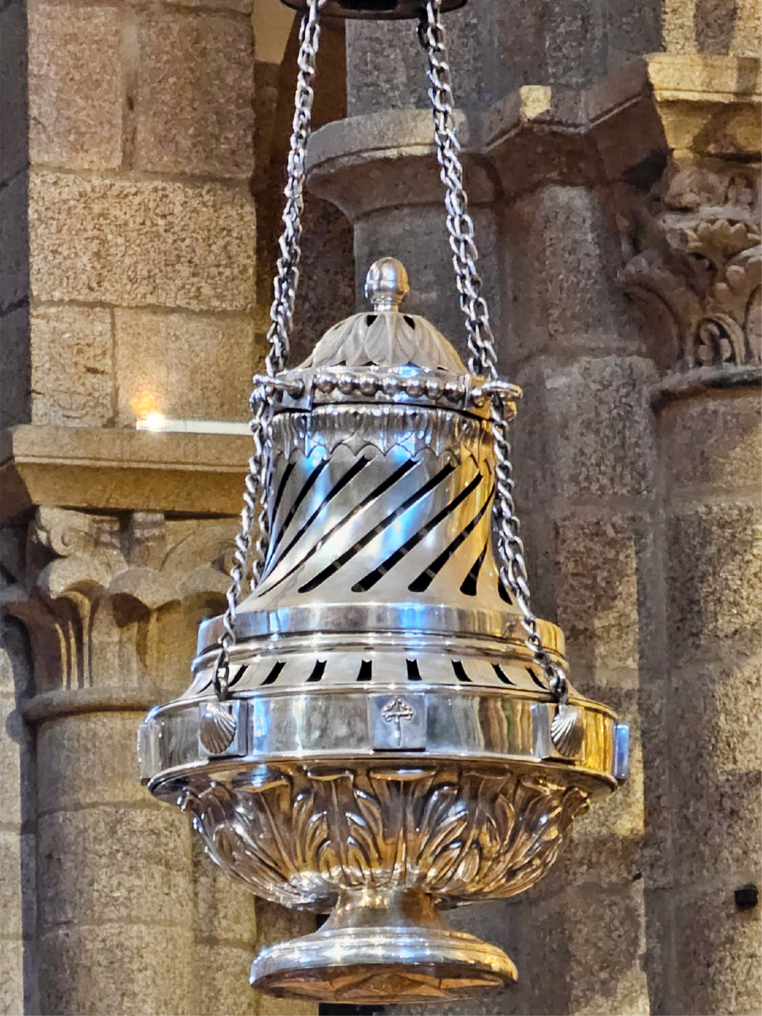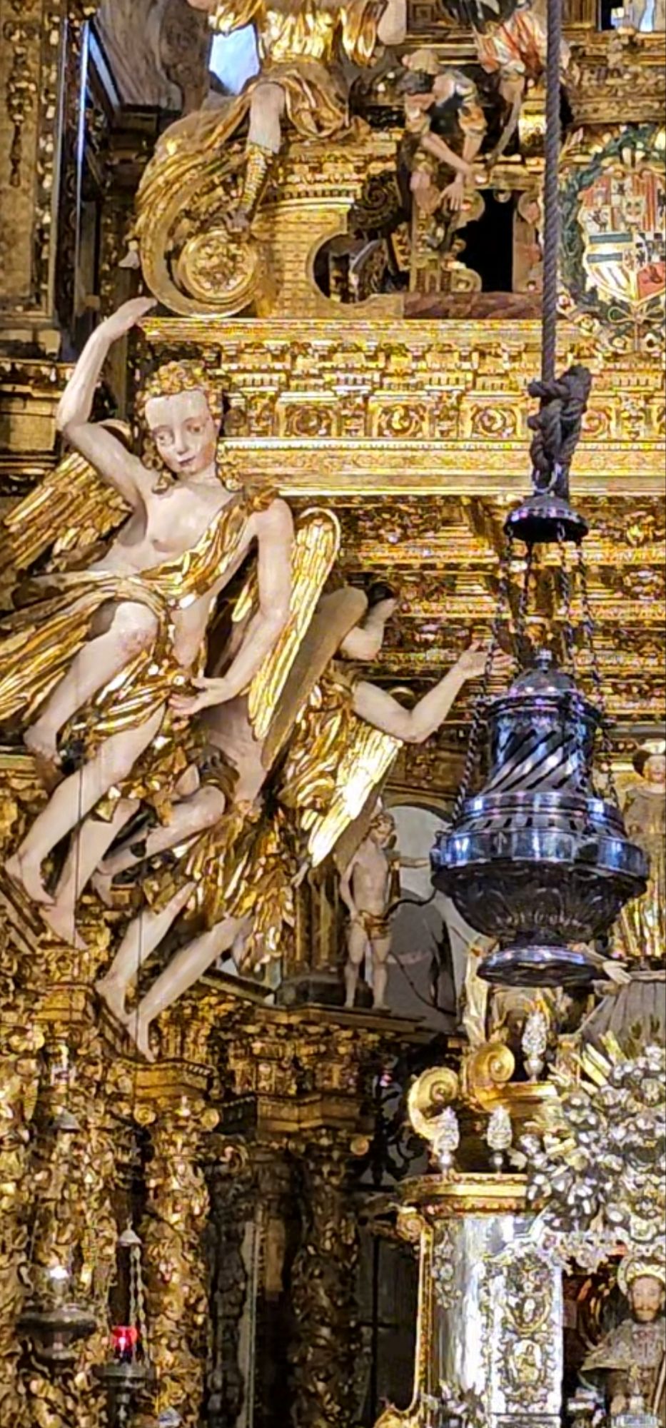 Majestuoso, colgado en el crucero central. Cuando vuela, el humo del incienso dibuja órbitas en el aire. Pesa 53 kilos, mide metro y medio, y ocho hombres —los tiraboleiros— lo lanzan en un ritual que une espectáculo y liturgia. Su vuelo no es solo movimiento: es un símbolo, un puente entre lo terrenal y lo celestial.