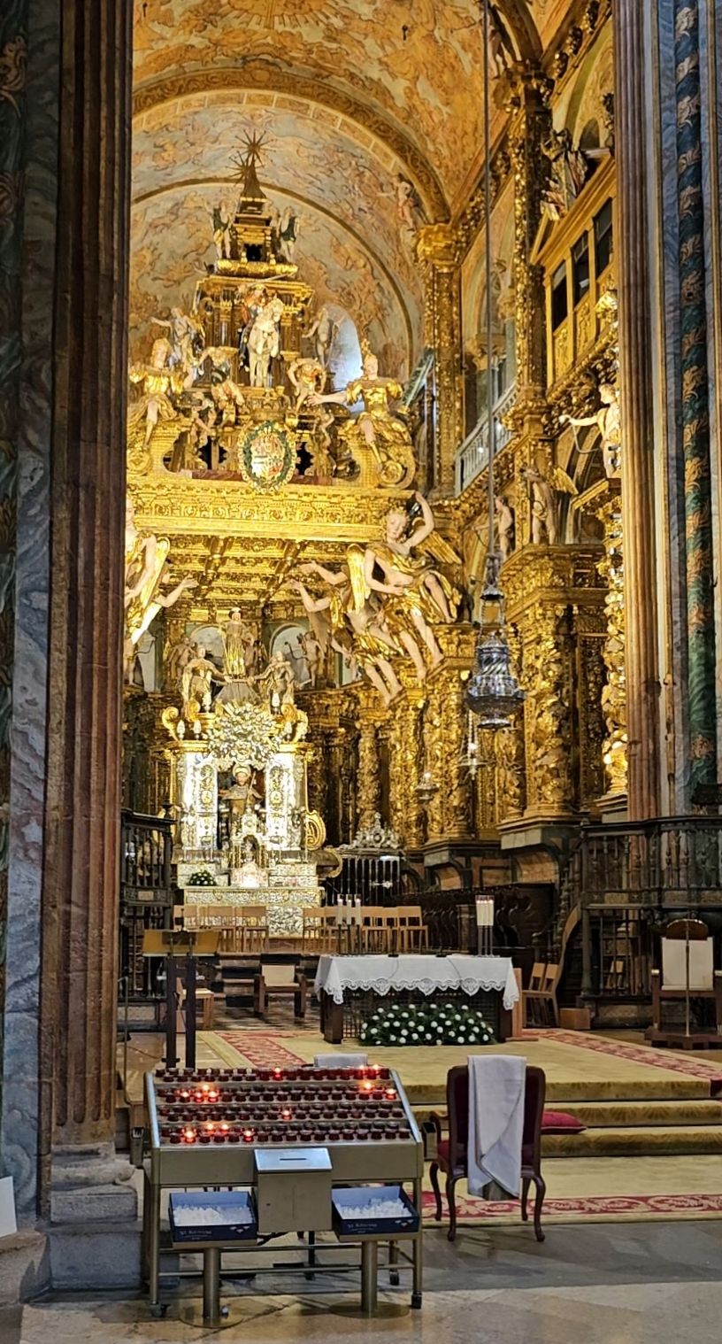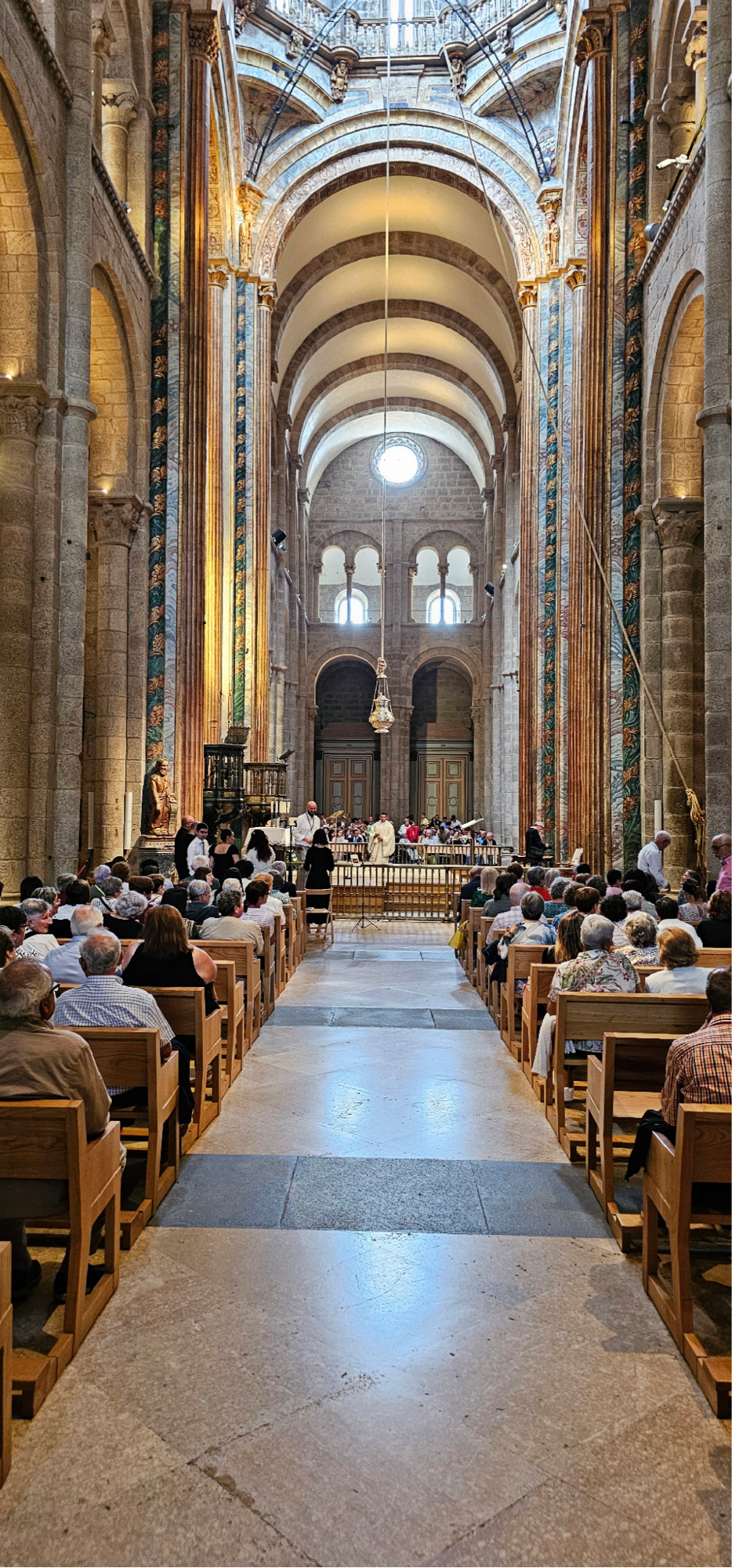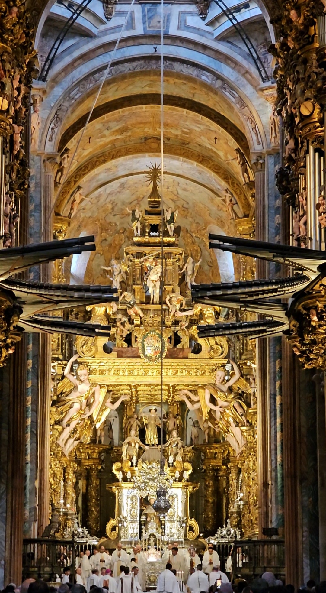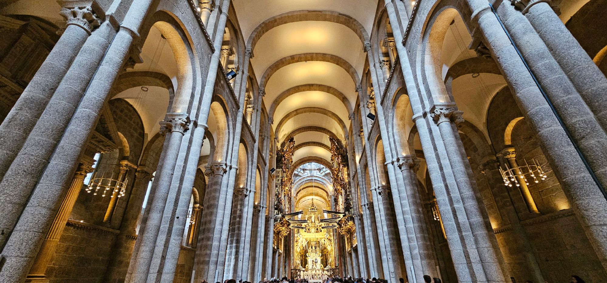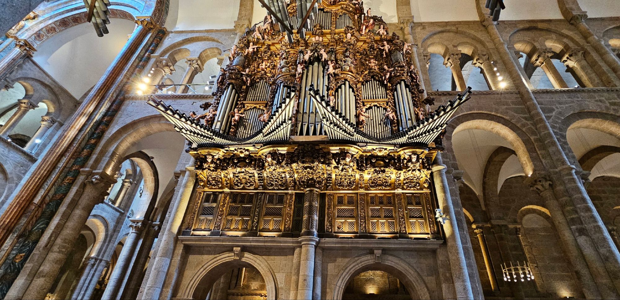 El interior es una sinfonía de piedra y silencio. Las columnas que sostienen la nave parecen hablar de siglos de pasos, de voces que se apagaron pero que aún resuenan en sus muros. Los órganos, suspendidos como barcos celestiales, parecen a punto de desplegar un mar de sonidos. El altar mayor, luminoso y dorado, concentra la mirada hacia ese punto donde reposa el Apóstol, Santiago, verdadero anfitrión de cada peregrino.