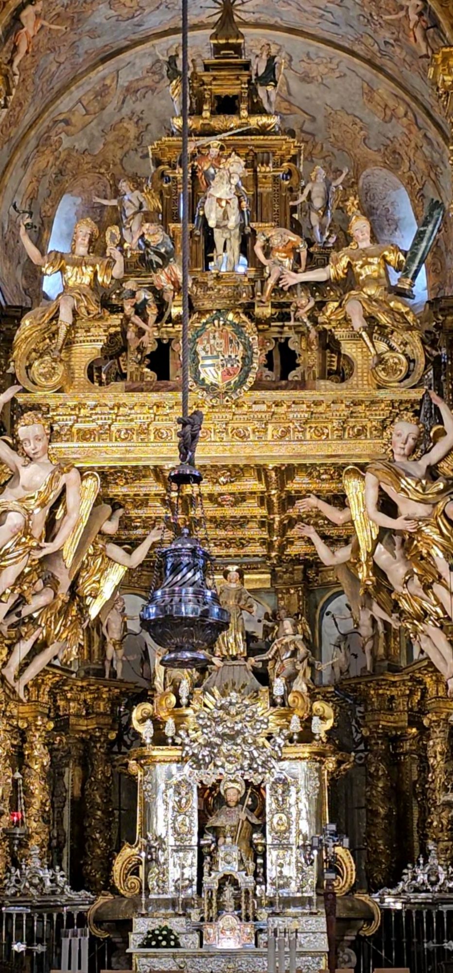 Un torrente de oro y luz. El barroco aquí se despliega como un abrazo. En el centro, la figura de Santiago Apóstol, peregrino y protector, recibe las miradas, las lágrimas, los rezos. Todo converge en él: fe, esfuerzo y gratitud.