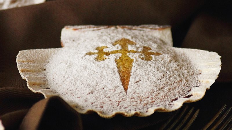 La encontrarás en muchos rincones de Galicia y del propio Camino: esculpida en iglesias, grabada en escudos y retablos, ondeando en banderas o incluso sobre los viejos mojones que marcan la ruta. En Santiago, luce con fuerza en la catedral y en su entorno, pero también en los detalles más cotidianos: en la famosa tarta de Santiago, donde se dibuja con azúcar glas como recordatorio dulce de este símbolo eterno.