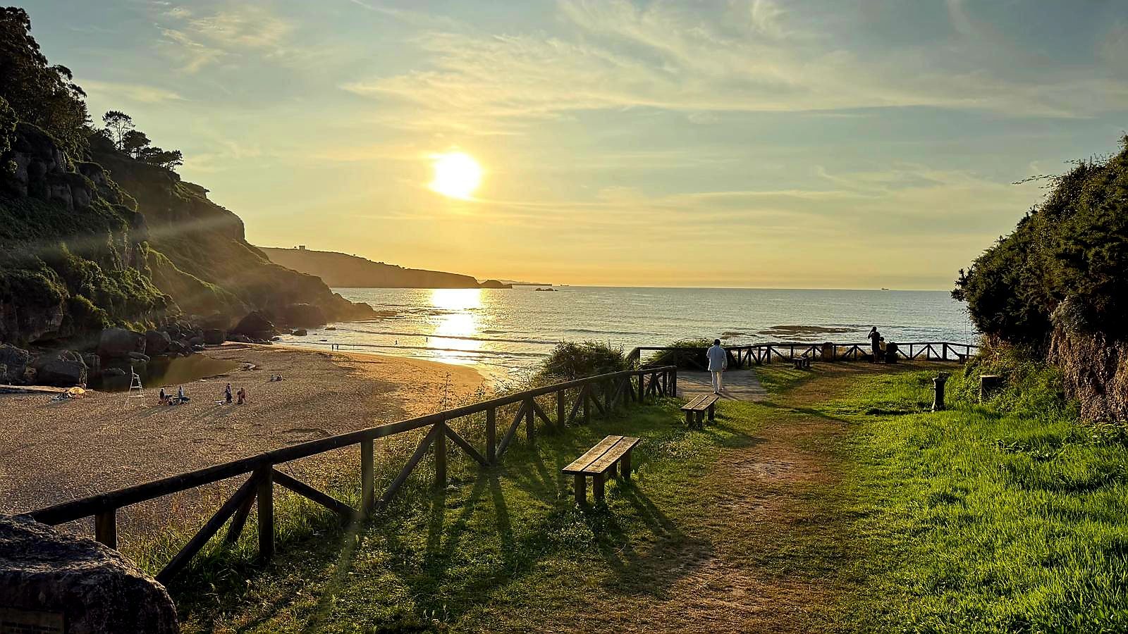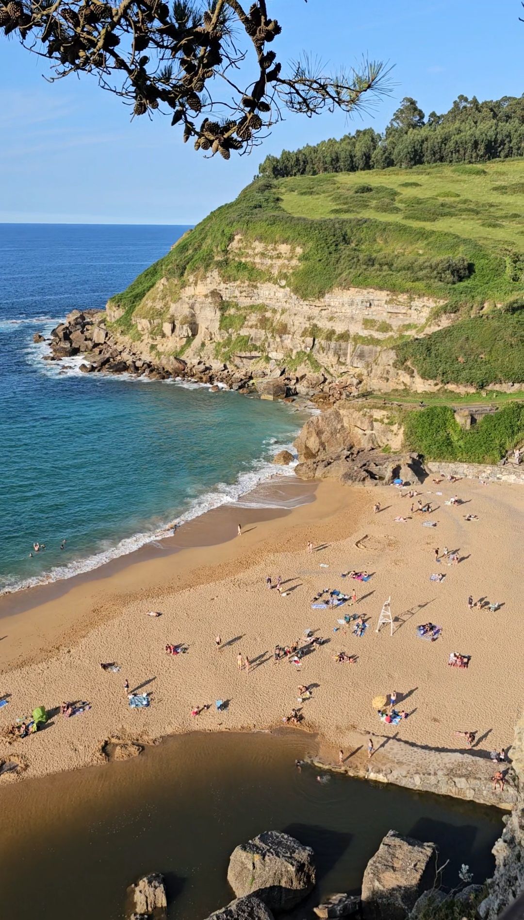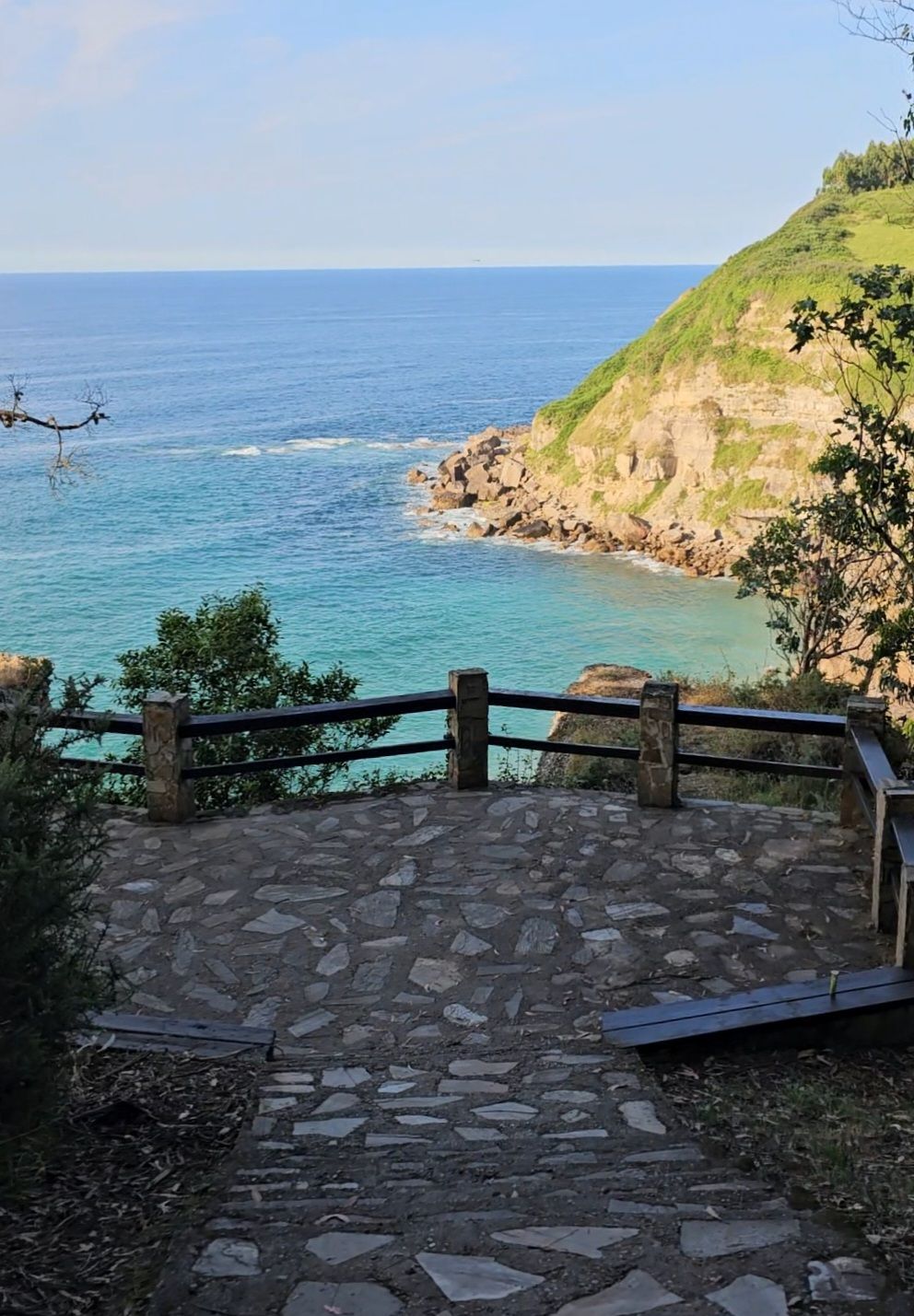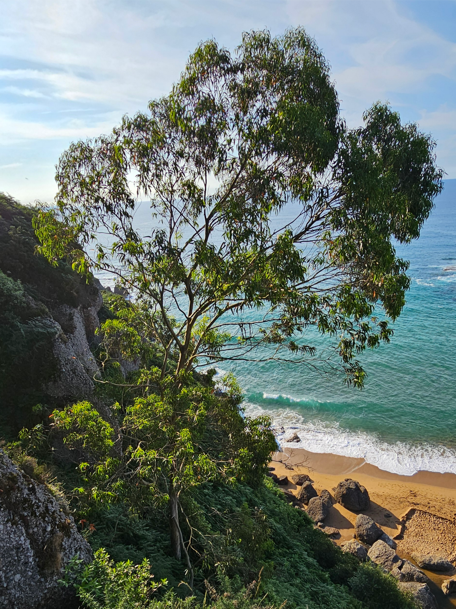 Desde la misma playa nace un sendero que asciende entre eucaliptos y helechos. Lo tomé con paso lento, como se suben las cosas que importan. En pocos minutos, el mirador. Y allí, de pronto, la belleza total, la playa se desplegaba abajo como un tesoro, la costa recortada en verdes, dorados y azules. El Cantábrico se abría ante mí, vasto y luminoso. Solo el viento, las aves y yo.
