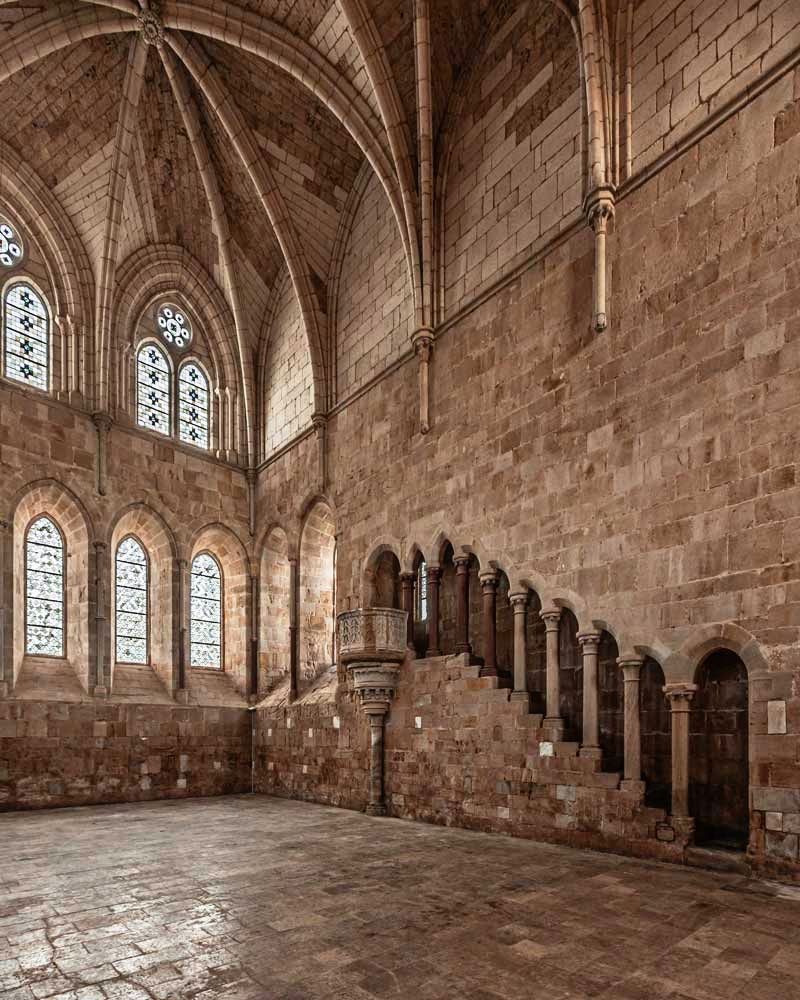 El refectorio —uno de los más impresionantes de España— es una nave altísima donde los monjes comían en silencio mientras escuchaban lecturas sagradas. El púlpito de piedra desde el que se leía aún se conserva intacto.