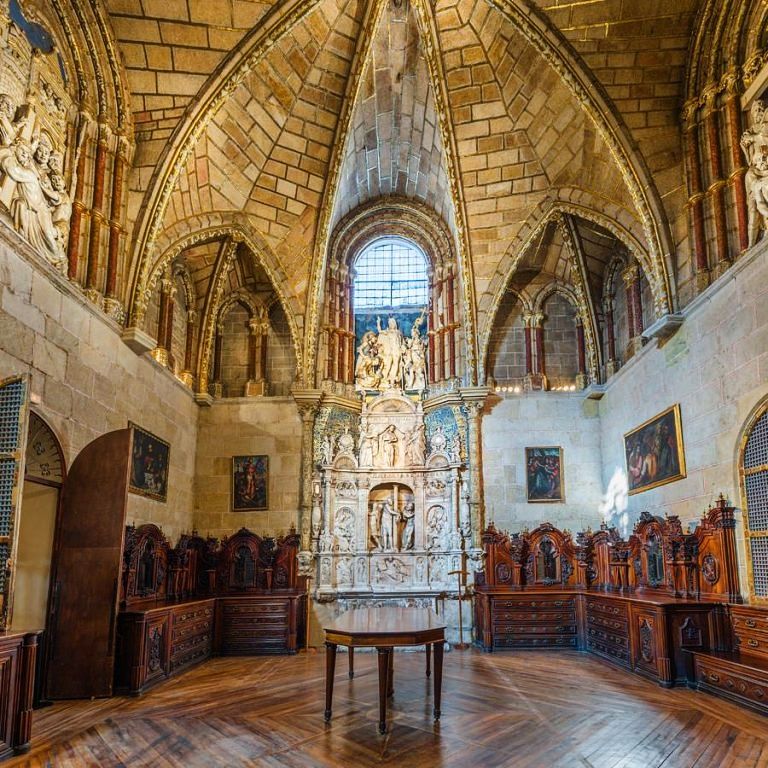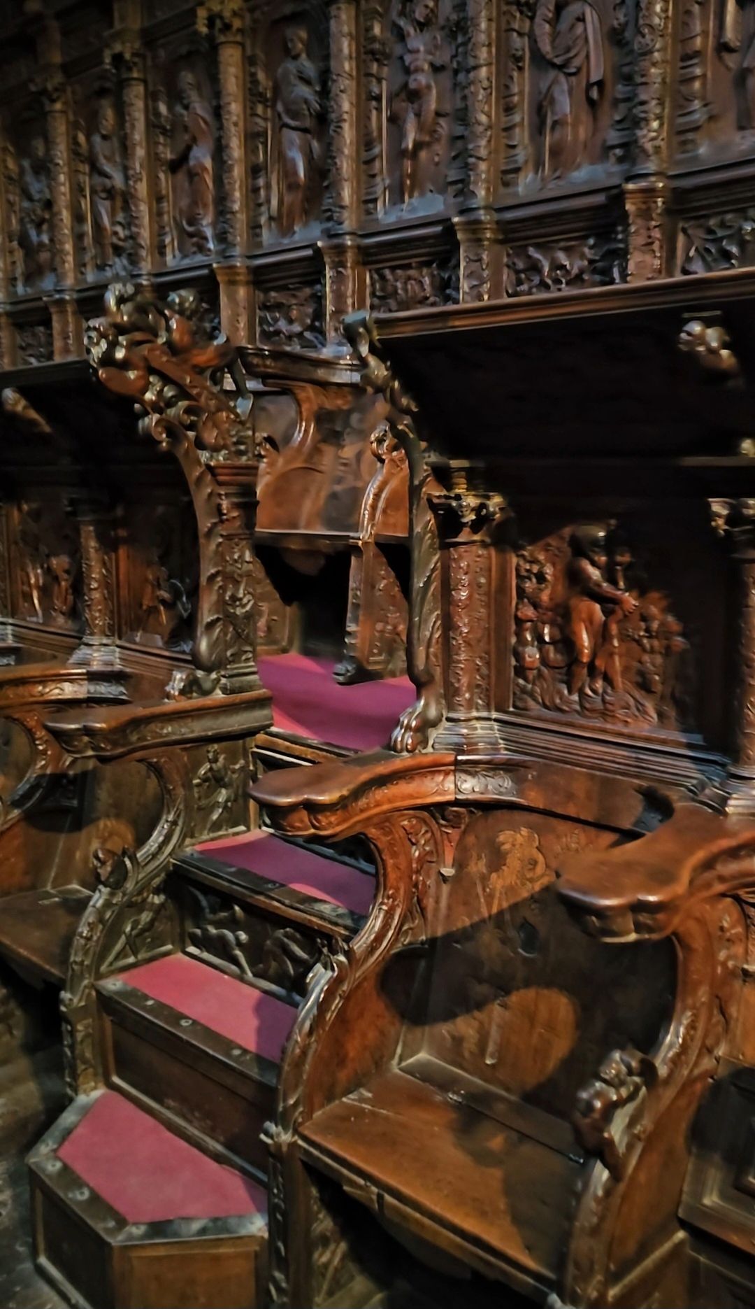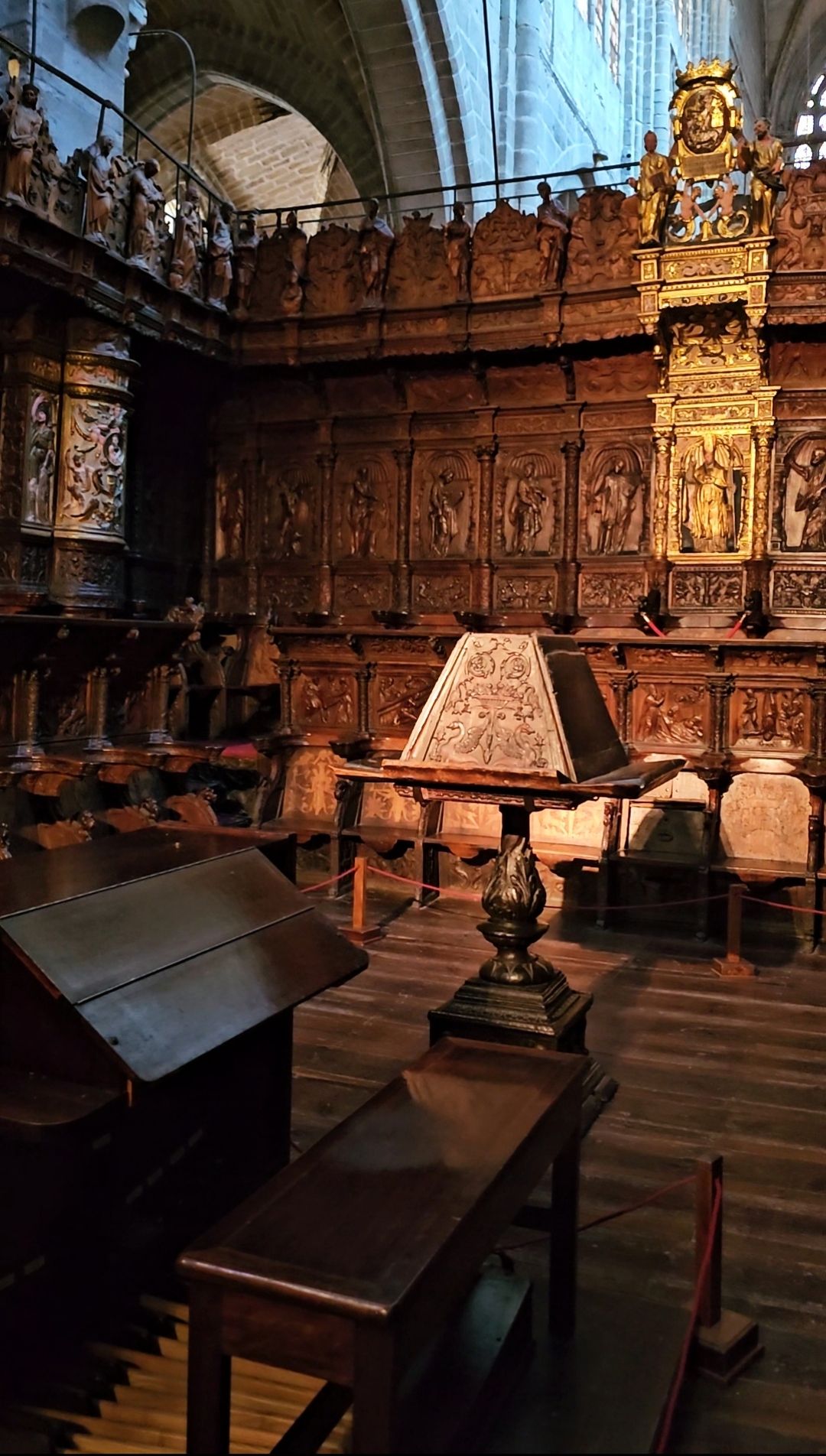 La sillería del coro, obra de Vasco de la Zarza, está tallada en madera oscura y respira solemnidad.