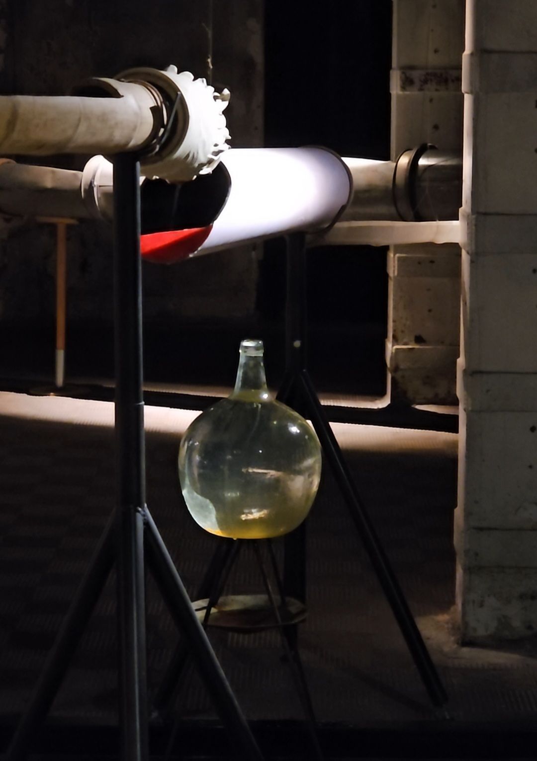 La obra nace precisamente del diálogo con el lugar que la acoge: la cámara frigorífica del antiguo Matadero Municipal de Madrid, atravesada por las canaletas de drenaje que funcionaban antaño. Recuperar ese elemento oculto y ponerlo de nuevo en movimiento es un acto poético y profundo: resucitar lo olvidado para construir un relato colectivo.