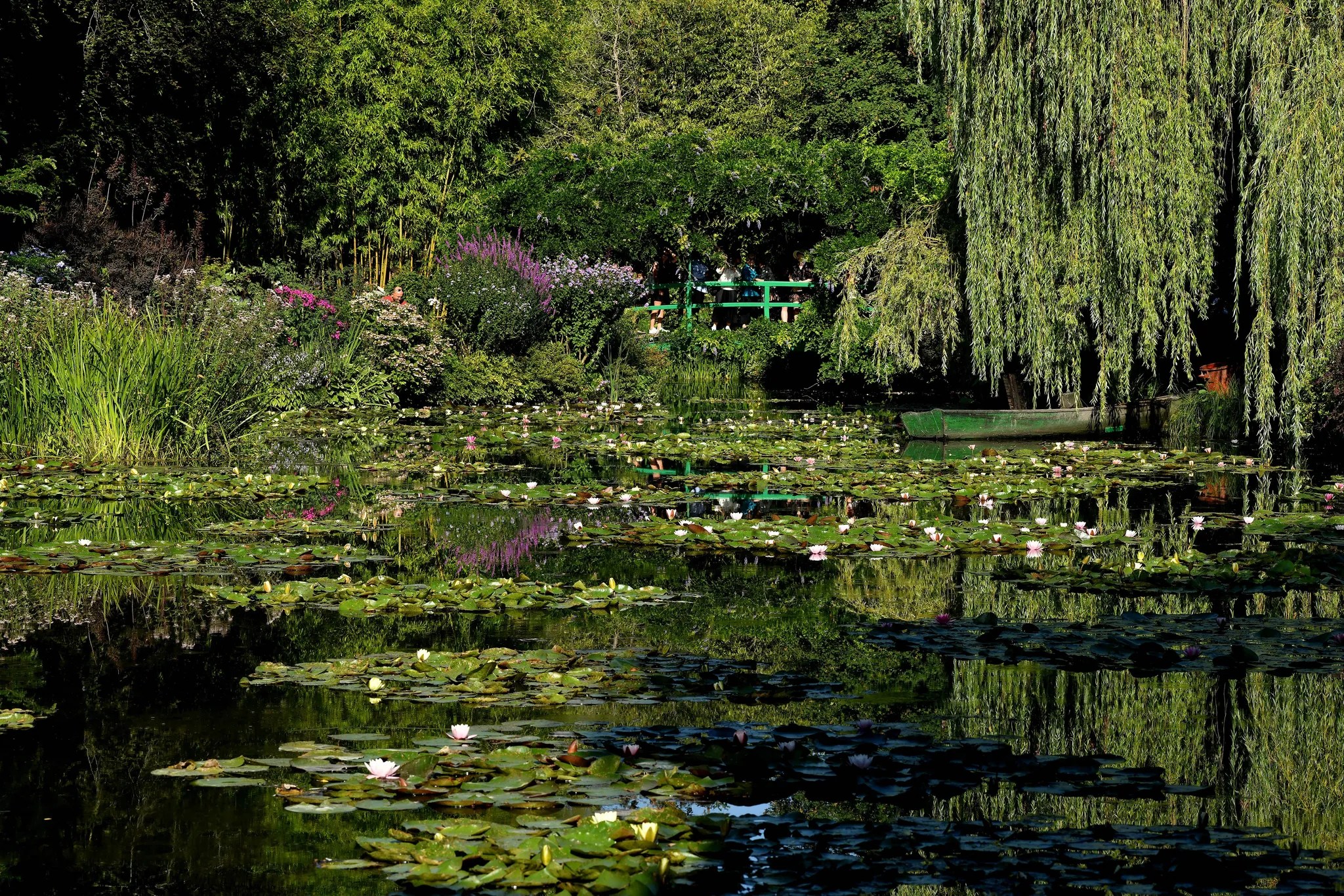 Monet compró este terreno años después de instalarse en Giverny. Desvió un brazo del río Epte, creó un estanque, plantó sauces llorones, bambúes, iris japoneses, glicinias… Y en medio del estanque, el puente japonés.