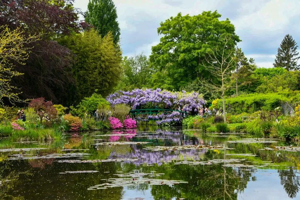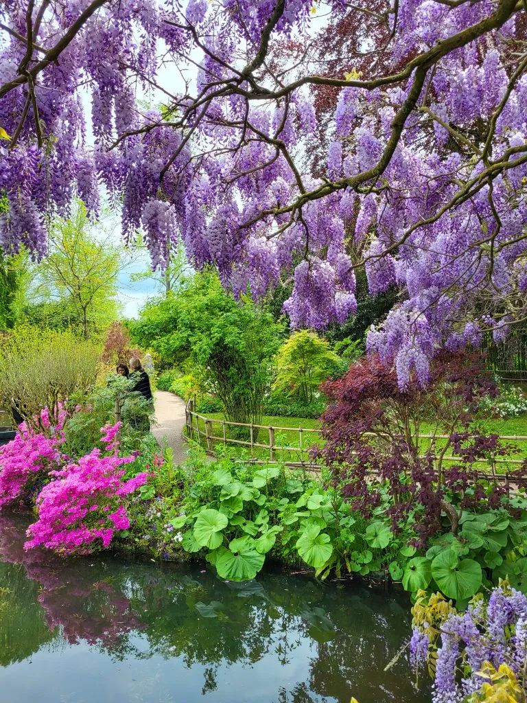 Ese puente verde que has visto mil veces en cuadros, postales, libros de arte. Ese puente curvo, pintado de verde para fundirse con el paisaje, cubierto de glicinas que cuelgan como cascadas violetas en primavera.