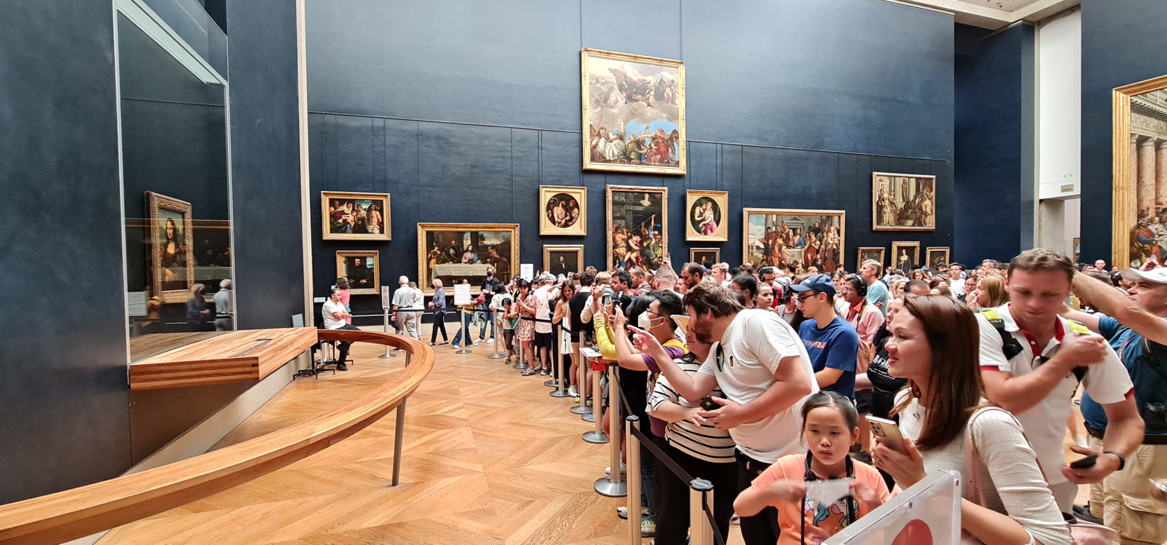 La Gioconda de Leonardo da Vinci está protegida tras cristal antibalas, rodeada de barreras que te mantienen a 4 metros de distancia. Guardias de seguridad controlan el flujo: puedes acercarte, hacer una foto rápida, pero no detenerte.