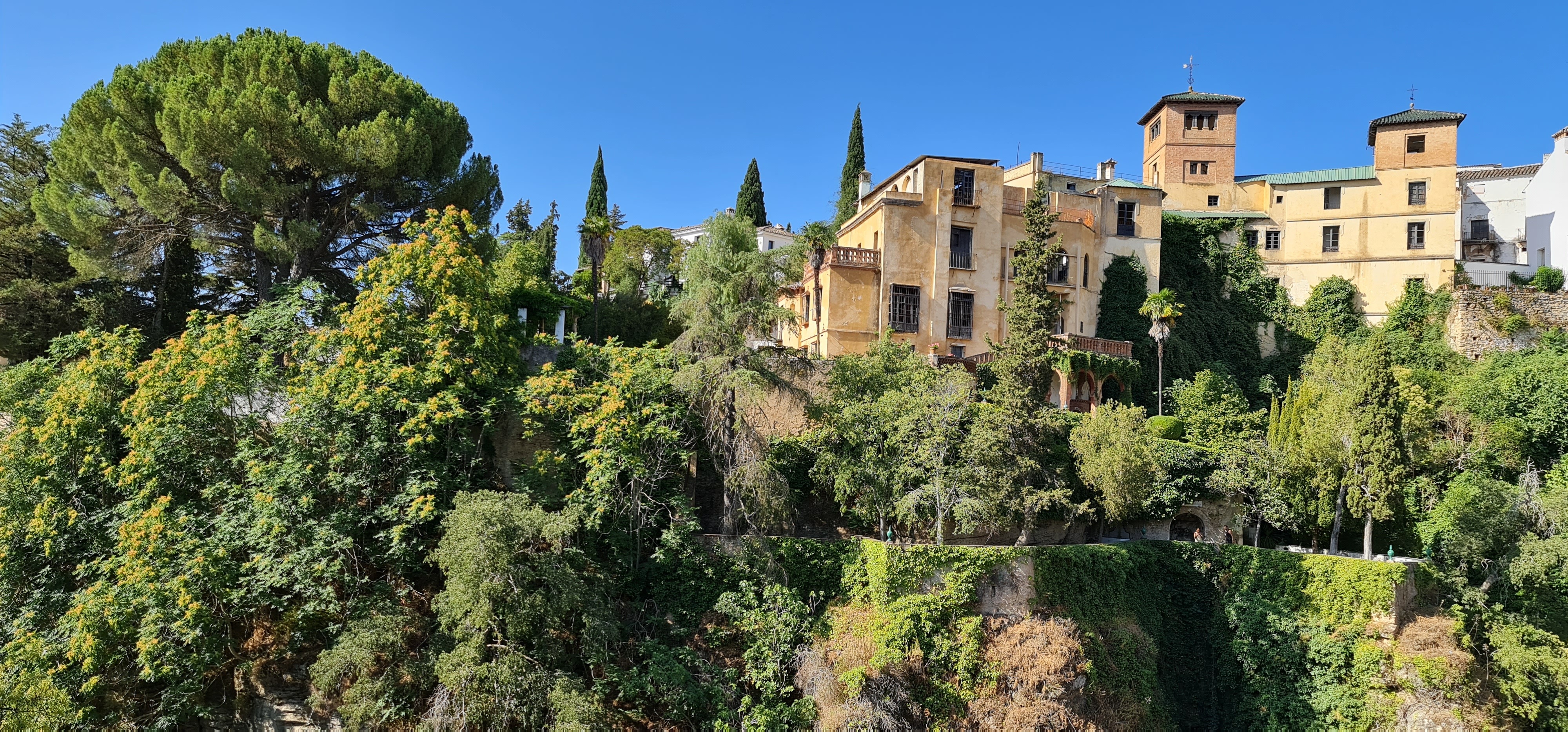 Dedica unos minutos a recorrer los jardines sin prisa y busca uno de los miradores naturales que se asoman al Tajo. Desde allí, la profundidad del desfiladero y la posición del conjunto permiten comprender por qué este lugar fue, durante siglos, una pieza clave en la defensa de Ronda.